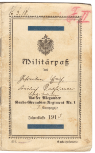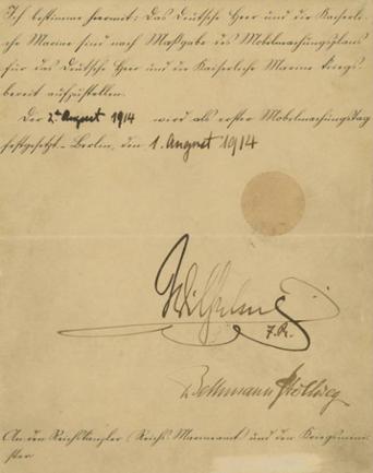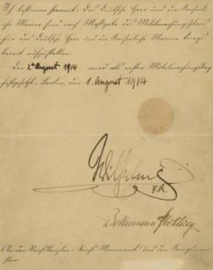 Am 1.8.1914 „erster Mobilmachungstag“: beim Morgenapell Bekanntgabe der geheimen Mobilmachungsbefehle. Vor dem Apell begrüßte mich der Waffenmeister als einen Mitarbeiter in der Waffenmeisterei.