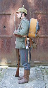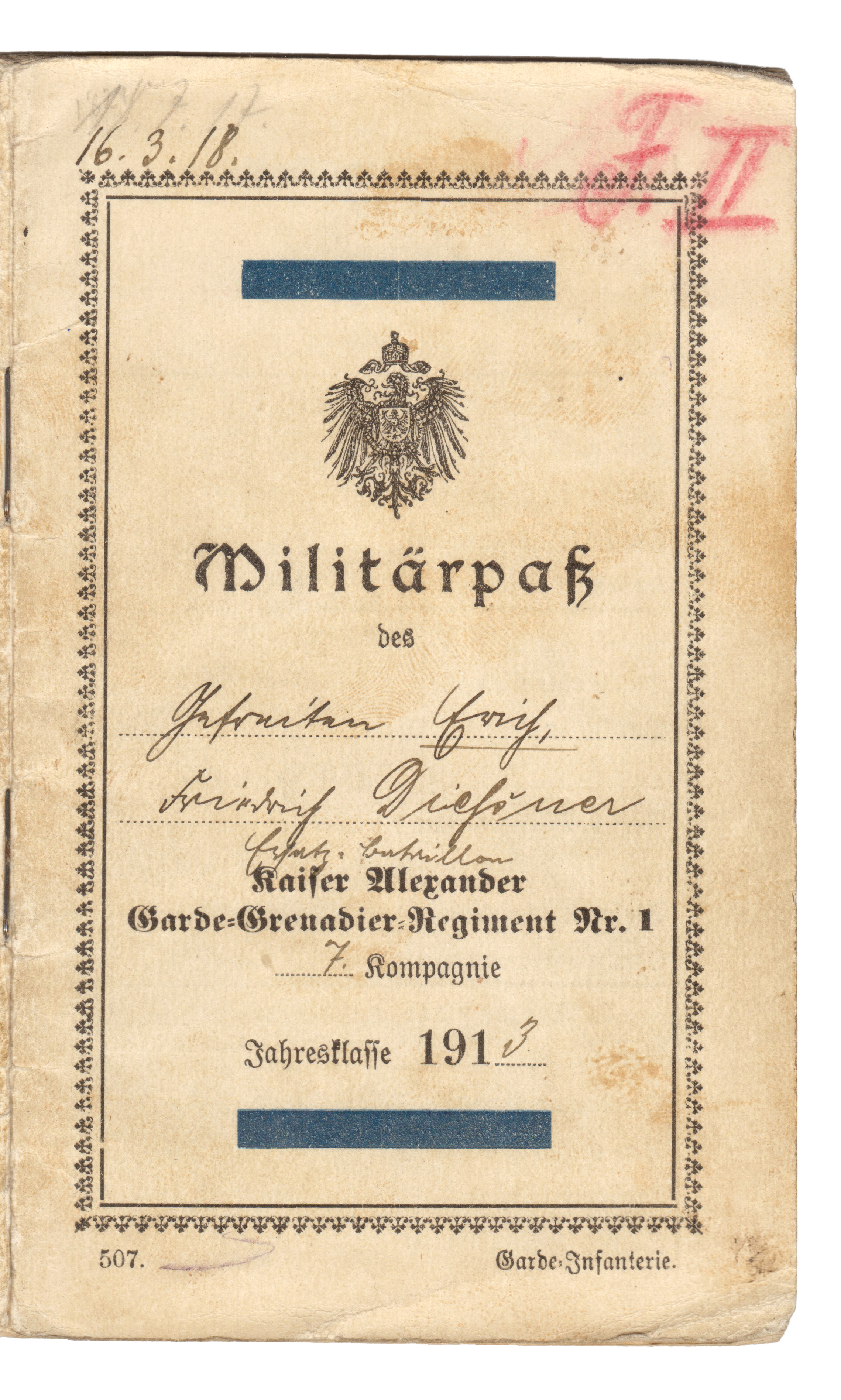 Nach dem Apell kam das große „Aufräumen“: alle Uniformstücke wurden auf der Kammer abgegeben, dafür empfingen wir die 1. Garnitur „feldgrau“. Diese war schon verpaßt und mit Namen versehen, als nur ein Umtausch. Nach dem Einkleiden waren wir neue Soldaten von Kopf bis Fuß. Für den Helm gab es einen feldgrauen Überzug, dazu gelbes Lederzeug sowie die im Wehrpaß eingetragene Aluminiumblechmarke für den Erkennungsdienst. Hauptarbeit war das Beladen der Fahrzeuge, Munition empfangen, die Munitionsfahrzeuge damit beladen. Wir, in der Waffenmeisterei, leisteten 16Stunden-Dienst, um MG und Fahrzeuge zu überprüfen. dazu alle blanken Waffen schärfen. Daß unser Alexander-Regiment als letztes Berlin verließ, war vorher nicht bekannt. So konnten wir nach dem tollen Tempo einige Tage für uns persönlich verbringen, für mich brauchte das den Abschied von der Verwandtschaft. Am 9.8.1914 schlug auch für uns die Stunde des Abschieds. Einen Tag vor Abmarsch erhielten wir in der Waffenmeisterei noch einen besonderen Auftrag – eine Zeichnung für ein Schutzschild für die MG-Besatzung. Dieses wurde dann in einer Berliner Maschinenfabrik aus Stahlblech ausgeschnitten und bearbeitet, dabei haben wir drei Waffenmeistergehilfen Tag und Nacht mitgearbeitet.