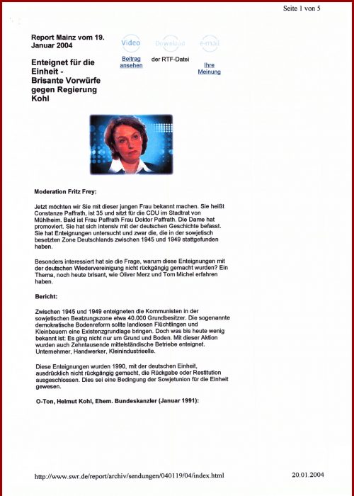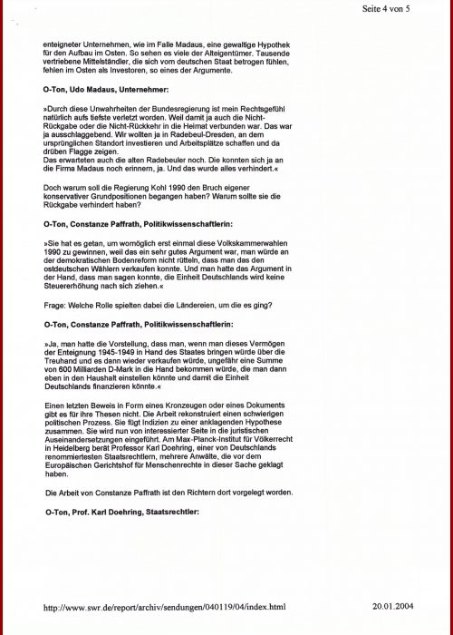 „Wie sich aufgrund aller zur Zeit vorliegenden und hier ausgewertete Quellen und der aus ihnen folgenden Rekonstruktion der aufeinander geschlüsselten Handlungen der in der Bundesrepublik politisch Verantwortlichen für die Einheit Deutschlands ergibt, hat die Bundesregierung Kohl die Wiedervereinigung Deutschlands entgegen ihren stets wiederholten Beteuerungen, nicht um den Preis der Hinnahme der zwischen 1945 bis 1949 oktroyierten „Enteignung“ in der damaligen sowjetischen Besatzungszone erlangt. Vielmehr ist es die Regierung der Bundesrepublik Deutschland selbst gewesen, die diesen vermeintlichen Preis hinter verschlossenen Türen erfand und für sich beschloß, ohne dabei von irgendwelchen äußeren politischen Zwängen genötigt worden zu sein. Und nicht eine fremde Macht, sondern ausschließlich sie selbst war die treibende Kraft, die den von ihr in eigener Regie gefaßten und vor der Öffentlichkeit geheim gehaltenen Plan in die Tat umsetzte. Ausschließlich der Regierung der Bundesrepublik Deutschland ist die Verantwortung dafür anzulasten, daß das in der sowjetischen Besatzungszone in den Jahren 1945 bis 1949 konfiszierte Vermögen nach der Wiedervereinigung nicht an deren Eigentümer zurückgegeben wurde. Und das geschah, so unsere Überzeugung, aus Motiv, mit dem Gegenwert dieses Eigentums die mit der Wiedervereinigung unvermeidlich auf die Bundesrepublik zukommenden Kosten zu decken und eine ansonsten unvermeidliche Steuererhöhung zu vermeiden. Dabei handelte es sich um einen Vermögenswert von ca. 500 Mrd. D-Mark.“