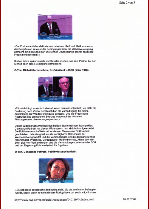 Kohl führte im Januar 1991 aus: „Der Fortbestand der Maßnahmen zwischen 1945 – 1948 wurden von der Sowjetunion zu einer der Bedingungen über die Wiedervereinigung gemacht. Und ich sage klar: Die Einheit Deutschlands konnte an dieser Frage nicht scheitern.“ Im März 1998 erkläret Gorbatschow: „Für mich klingt es einfach absurd, wenn man mir unterstellt, ich hätte die Forderung nach Verbot der Restitution als Vorbedingung für meine Zustimmung zur Wiedervereinigung gemacht. Und die Frage nach Restitution des enteigneten Besitzes wurde auf der höchsten Führungsebene niemals angesprochen.“ Beide Zitate sind dem Interview SWR Report Mainz mit C. Paffrath vom Januar 2004 entnommen (siehe Anhang).